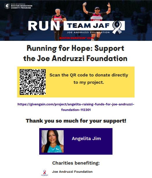 I will be running under the Joe Andruzzi Foundation (JAF)—an incredible organization that provides financial relief to cancer patients and their families. JAF helps ease the burden of everyday expenses such as transportation, household costs, and medical care, allowing families to focus on what truly matters: fighting cancer.