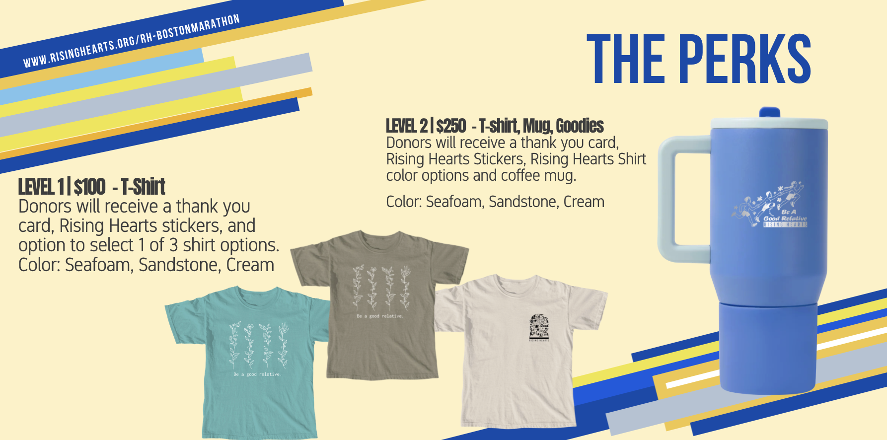 + With every $100 donation, you get a new Rising Hearts shirt and other smaller goodies.