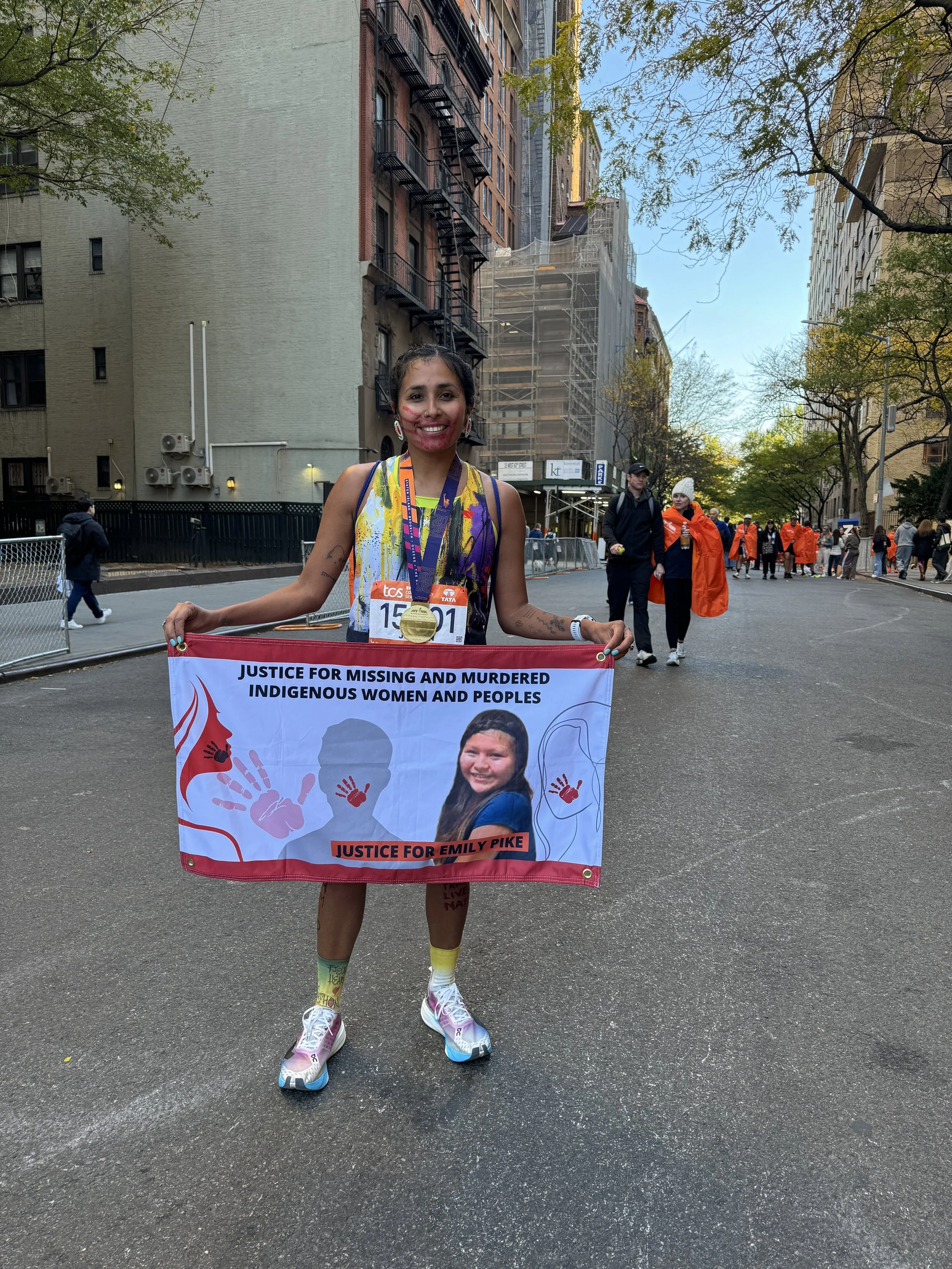 Now back to my run. This is my second my NYC Marathon and both have been dedicated to raising awareness for missing and murdered Indigenous Peoples. And more recently, for Emily Pike. Thank you to my dear friend, Mary Kim, who has helped connect me with Emily’s family and help to raise funds for their efforts to get justice for Emily. This run, this race, was for Emily. It was for a free Palestine. It was to encourage people to go vote since elections were a couple days later. It was a call to protect Trans lives. And if I had more room on my body, it would be a call to keep families together, to protect immigrants. Running means so much more beyond just the fitness aspect and commitment of it all. It fuels my why. My family, especially my 3 babies, are my reason for being a voice and fighting for their future, all futures. So my call to you, if you’re reading this, is to please donate towards the Emily Pike billboard campaign. Link is below!