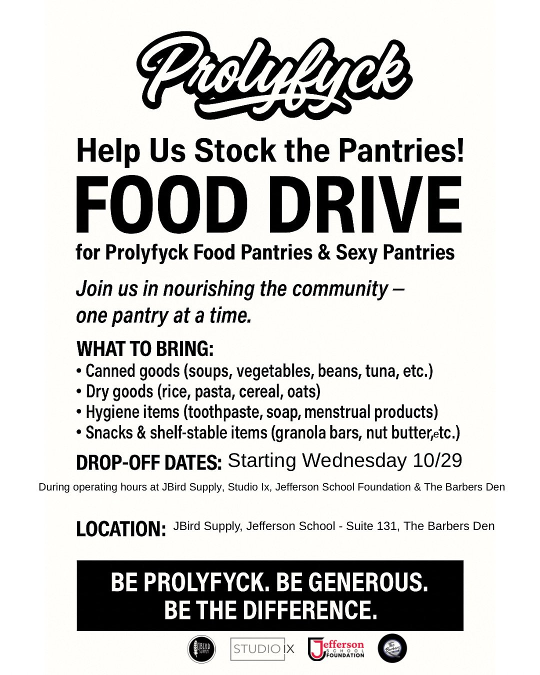 Help stock the Prolyfyck Pantries and if you can donate items, here’s a donation link!