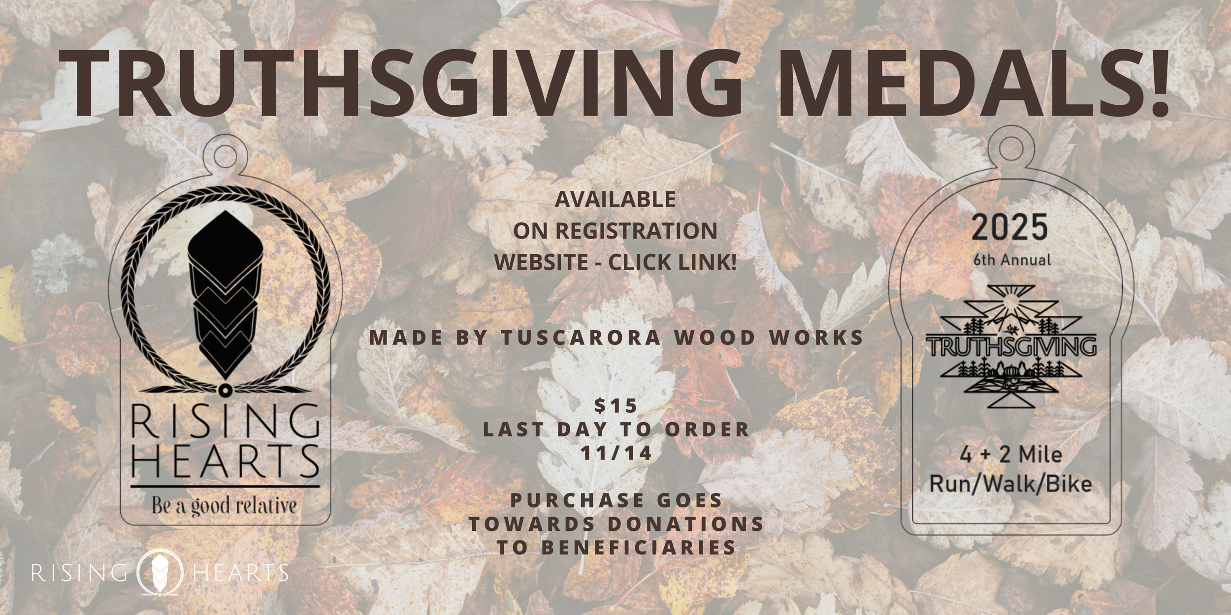 Hand crafted wooden medals by Tuscarora Woodworks, 50 available for a $15 donation that contributes to the overall donations to Beneficiaries!