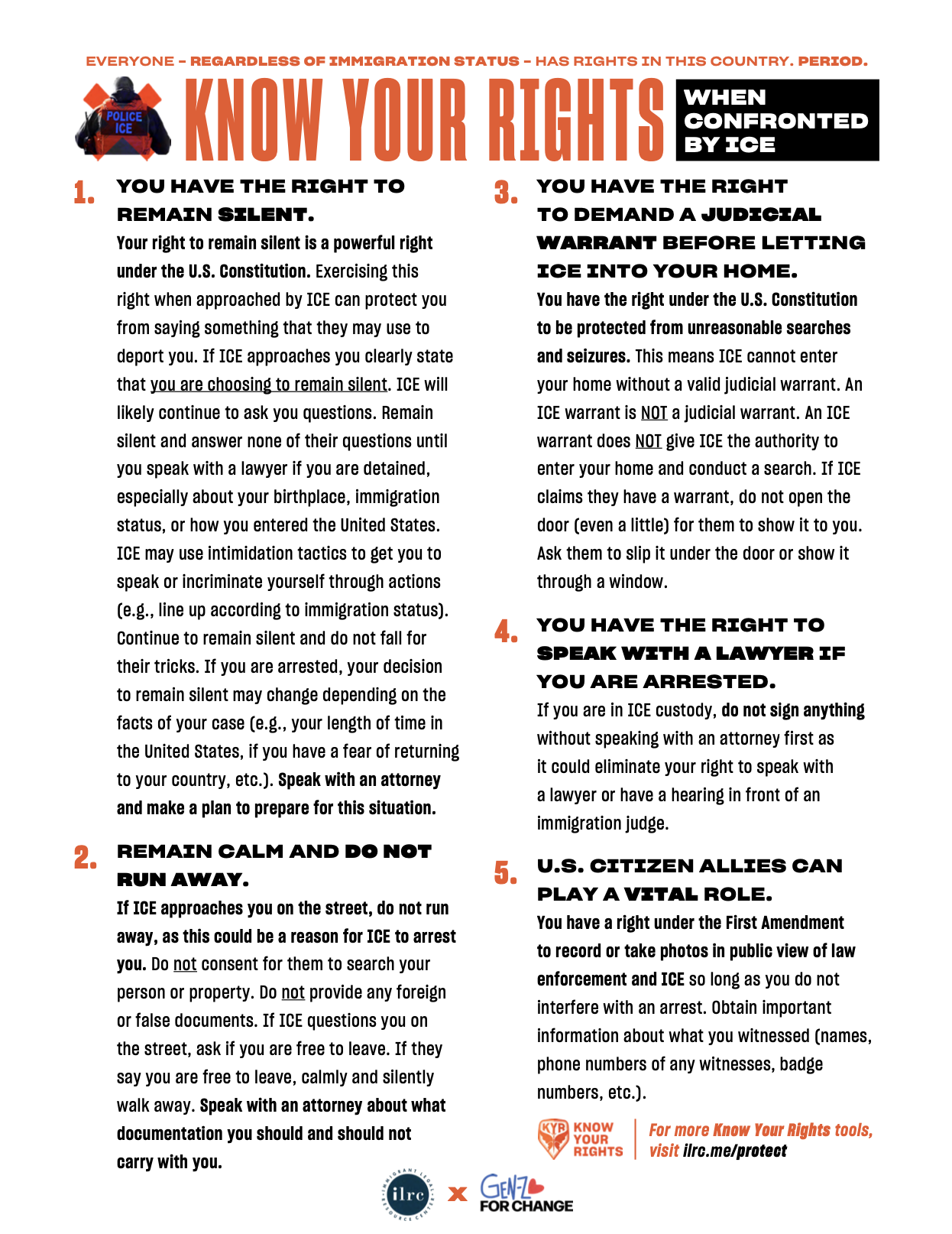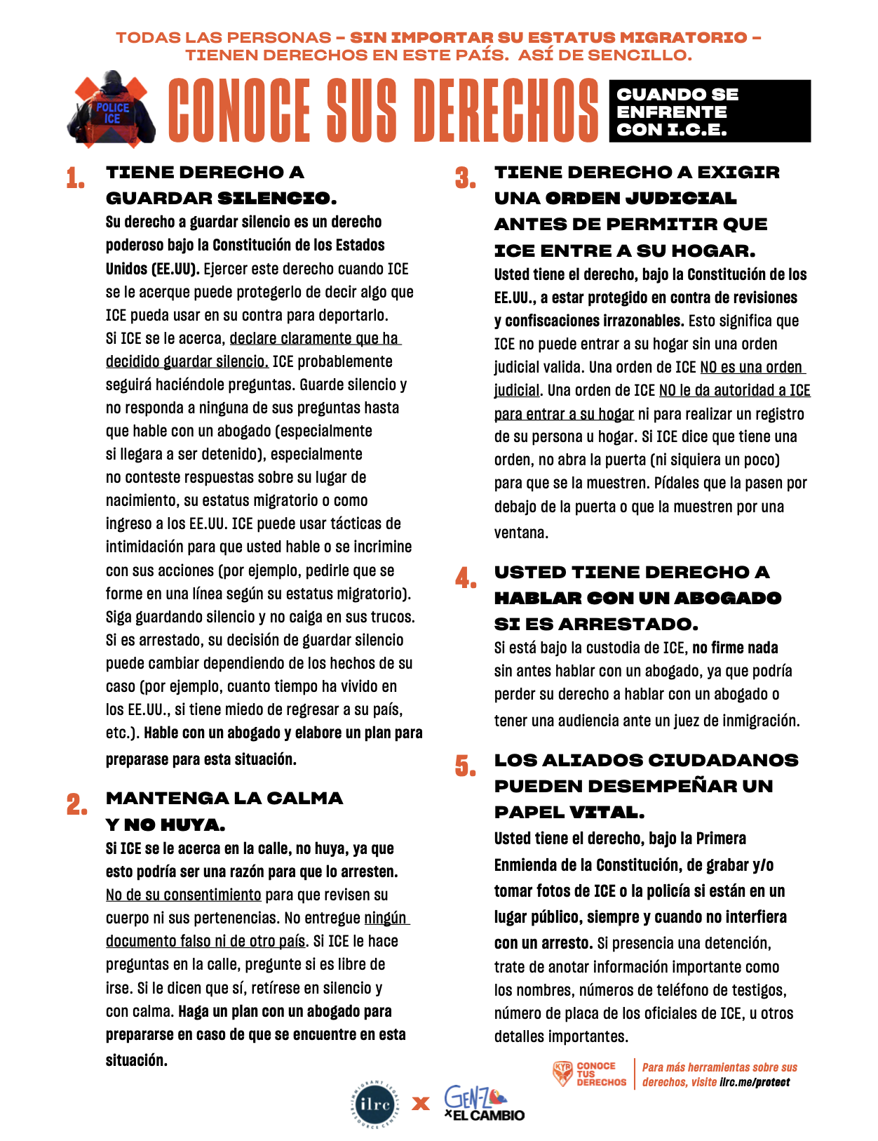 “All people in the United States, regardless of immigration status, have certain rights and protections under the U.S. Constitution. The Know Your Rights Red Cards were created to help people assert their rights and defend themselves against constitutional violations. Knowing and asserting rights can make a huge difference in many situations, such as when ICE agents go to a home. Red cards provide critical information on how to assert these rights, along with an explanation to ICE agents that the individual is indeed asserting their rights.”