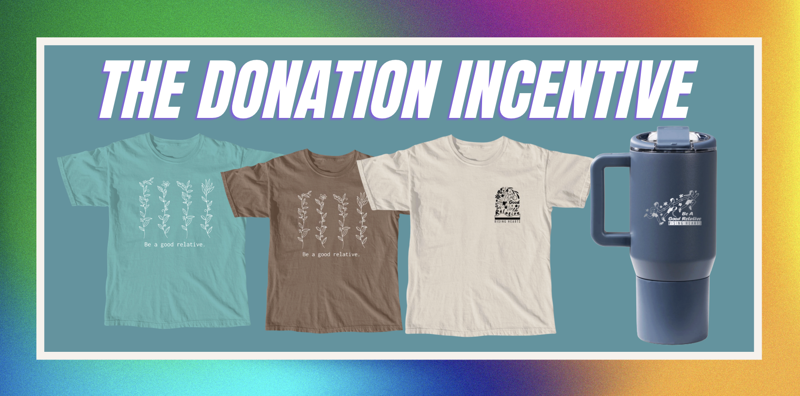 Donors will receive a thank you card, Rising Hearts stickers, RH notebook and pen, and option to select 1 of 3 shirt options.